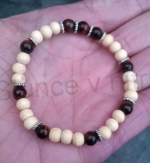 Zajimavé minerální provedení byčí oko náramku s kombinací dřevěných koralků a ozdob. Náramek je velmi vysoké kvality. Náramek je na dvojité pružné gumičce. Zdobí se jím nejedna celebrita a stal se hitem letošní sezóny.