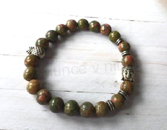Zajimavý minerální náramek přírodní unakit s ozdobou buddha, ananas. Náramek se skladá z velmi kvalitník unakit přírodních korálků a kovových ozdob bez kadmia a olova. Náramek je navlečený na dvojité pružné gumičce, náramek se lehce přizpůsobí.