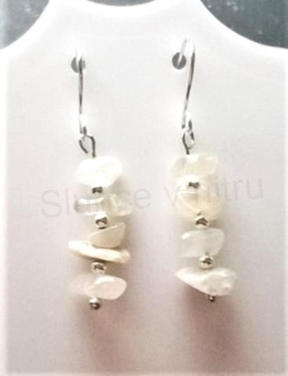 Náušnice tvoří měsiční kámen minerální zlomky. Také jsou tvořeny z klasických afroháčků, které jsou zakončeny silikonovou puzetkou. Silikonové puzetky zabraňujé ztrátě náušnic. Každý pár náušnic je originál. Každý kámen je jiný.