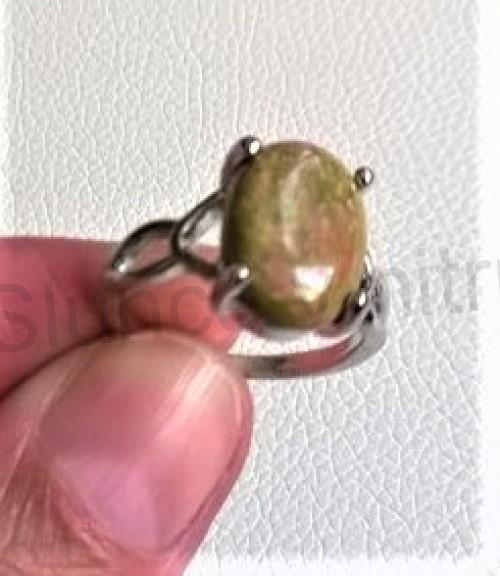 Krásný postříbřený romantický prsten pro ženy, dívky s minerálním kamenem unakitt. Ručně zpracován, dokonalá jemná práce. Prsten je v hladkém provedení, uprostřed prstenu je vsazen minerální kámen, zajištěn tak aby nemohl vypadnout, jemné zdobení, prsten je z pokovaného postříbřeného kovu. Modní doplněk k ostatním šperkům, krásně ladí.