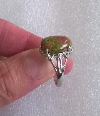 Krásný postříbřený romantický prsten pro ženy, dívky s minerálním kamenem unakitt. Ručně zpracován, dokonalá jemná práce. Prsten je v hladkém provedení, uprostřed prstenu je vsazen minerální kámen, zajištěn tak aby nemohl vypadnout, jemné zdobení, prsten je z pokovaného postříbřeného kovu. Modní doplněk k ostatním šperkům, krásně ladí.