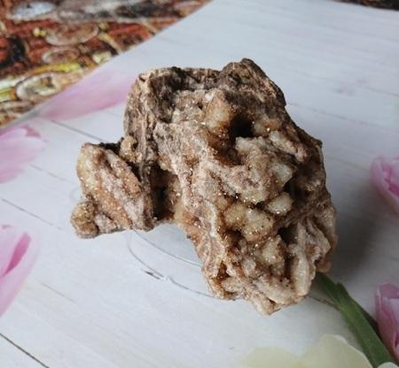 Jak vznikl: Jde o tzv. pseudomorfózu (odlitek). Křemen obrostl mřížku jiného minerálu, který se později rozpustil. Zůstala jen tato křemenná „kostra“ pokrytá tisíci drobnými, třpytivými krystalky.