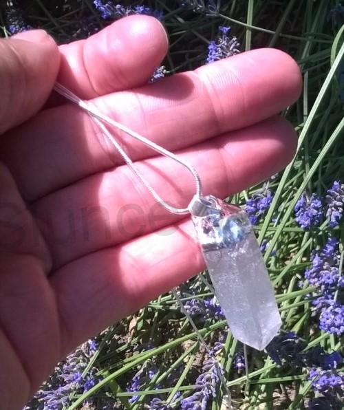 Nádherná křišťálová špice. Křišťál má galvanické pokovaní v místě uchytu, kde je uchycena na dlouhém hadím postříbřeném řetízku. Křišťál velmi přispivá k harmonizaci, pozitivní energii a čištění organizmu.