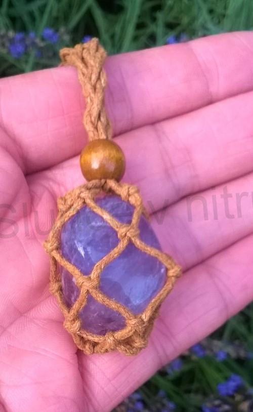 Tento nádherný náhrdelník s přírodním tromlovaným ametrínem pochází z Brazílie a je zasazen do ručně pletené, pevné voskované šňůrky. Kámen je bezpečně uchycen v makramé síťce, kde velmi dobře drží, a navíc je zajištěn dřevěnou ozdobnou kuličkou, která dodává šperku přírodní a harmonický vzhled.