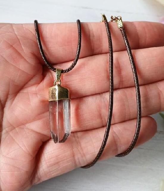 Nádherná elektrolyticky pokovená přírodní křemenná křišťálová špice, horský křišťál. Křišťál má nerez ocel v místě uchytu, kde je uchycena na hnědé kožené voskované šňůrce s přídavným řetízkem. Křišťál velmi přispivá k harmonizaci, pozitivní energii a čištění organizmu.