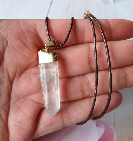 Nádherná elektrolyticky pokovená přírodní křemenná křišťálová špice, horský křišťál. Křišťál má nerez ocel v místě uchytu, kde je uchycena na hnědé kožené voskované šňůrce s přídavným řetízkem. Křišťál velmi přispivá k harmonizaci, pozitivní energii a čištění organizmu.