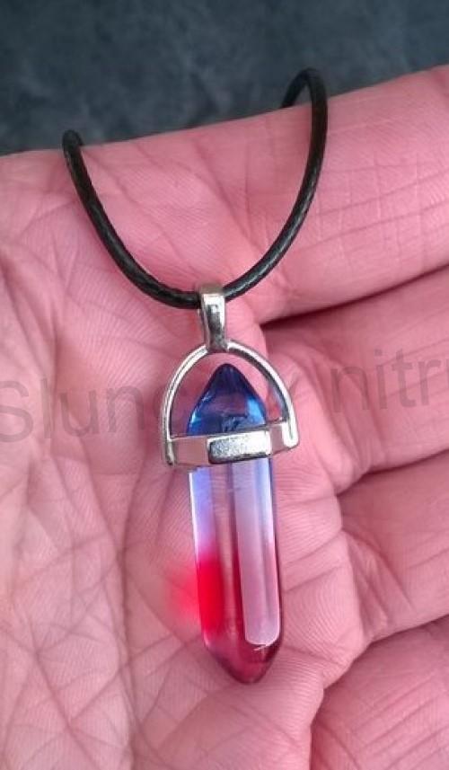 Nádherný náhrdelník duhový křišťál ( Aqua aura), má galvanické pokovaní v místě uchytu, kde je uchycena na kožené voskované šňůrce s přídavným řetízkem. Překrásný drobný šperk.