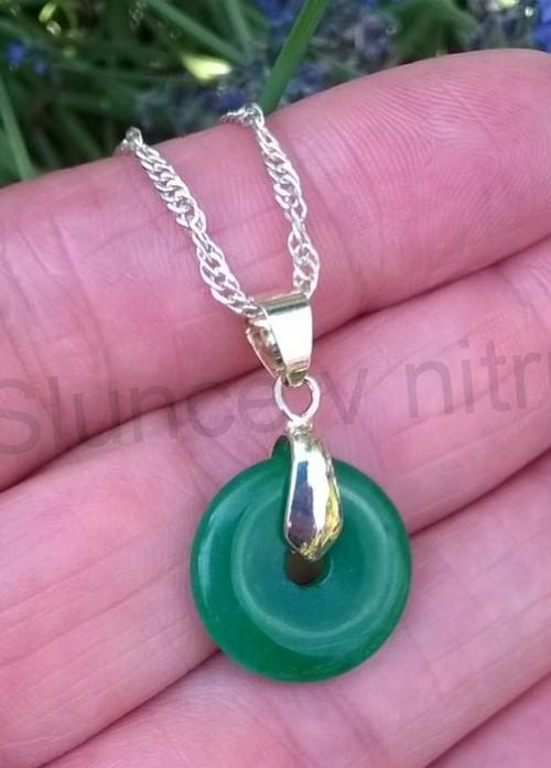 Krásný postříbřený řetízek a přívěšek s minerálním kamenem jadeitu do tvaru donutu, donutku. Kámen má krásné přírodní zbarvení. Řetízek je kroucený.