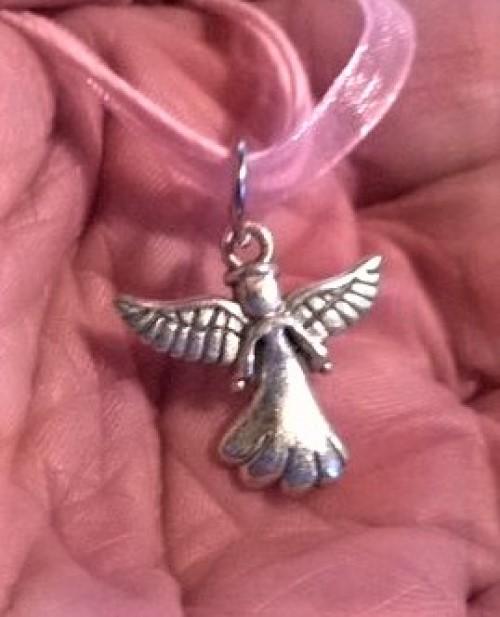 Zajimavý náhrdelník oboustranný anděl, andílek na ozdobné stužce. Anděl je uchycen na ozdobné stužce s přídavným řetízkem. Krásný drobný šperk.