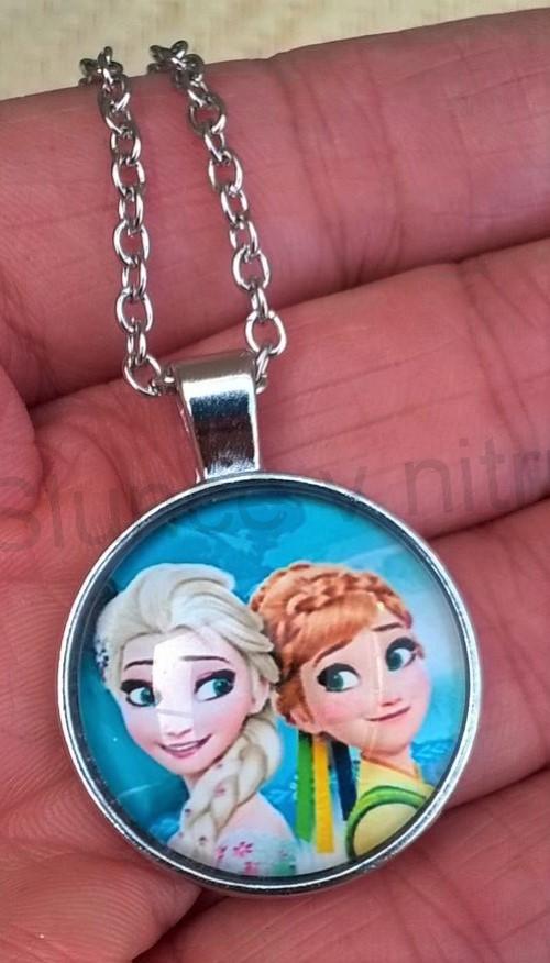 Nádherné řetízkové provedení náhrdelníku s přívěškem Princezny Anny a Elsy filmová pohádka. Náhrdelník je velmi modní, pro všechny věkové kategorie. Řetízek je zakončený karabinkou, přívěšek je z chirurgické oceli, řetízek je z galvanizovanýho kovu a skla.