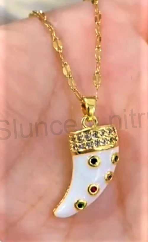 Krásný modní řetízkový náhrdelník s imitací 3D vlčího zubu s kamínky v barevném provedení z chirurgické oceli. Vhodný na jakoukoliv událost. Přívěšek zubu je kombinován s chirurgickou oceli a tvoří zajimavý šperk. Zajimavý jemný šperk.