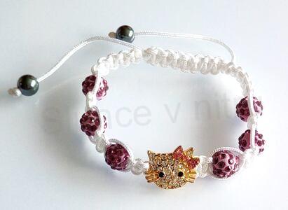 Velmi luxusní šperk. Krásný třpytící se Shamballa náramek s pave korálky (Swarovski elements) zdobený ozdobou kočičky, kočka, kočička (Hellou Kity). Každý pave korálek je propleten s velkou péči. Náramek je velmi vysoké kvality. Náramek je ručně tkaný z kvalitní nylonové bavlnky, bílé barvy. Tento jedinečný shamballa náramek je precizně osázen zářivými krystaly v různém barevném provedení. Na světle se výrazně třpytí. Zdobí se jím nejedna celebrita a stal se hitem letošní sezóny. Krystaly jsou odolné a vydrží Vám déle než klasická bižutérie. Na konci stahovacích šňůrek jsou 2 lesklé korálky o průměru 6 mm.