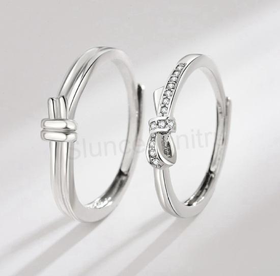 Tento moderní pár nastavitelných snubních prstenů je ideální volbou pro páry, které hledají symboliku, eleganci a jemně zdobený design. Oba prsteny mají uprostřed uzlový motiv osazený kubickou zirkonií, která dodává šperkům jemný lesk a slavnostní charakter.