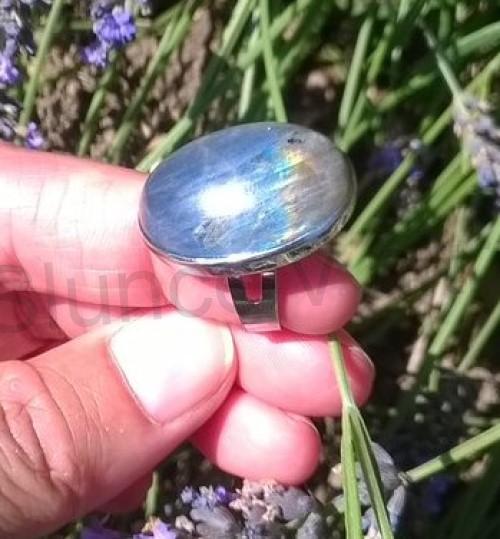 Elegantní nastavitelný prsten vyrobený z ošetřeného kovu a přírodního minerálu labradoritu, labradorit má barevné odleskya tím vynikne jeho dokonalá krása. Prsten lze mírně nastavit, přizpůsobit. Překrásný přírodní šperk minerál labradorit je z kabošonu mugle do různých tvarů.