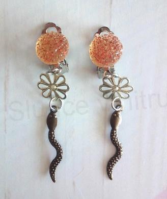 Zajímavé hadí, had klipsy, klipsny náušnice s orgonitem u kterých nemusíte mít propíchnuté ucho. Krásná sladěná kombinace hada s kabošonem orgonit (slunce v nitru). Pryč jsou dny, kdy jste se trápily jak vyřešit náušnice. Jsou skvělým dárkem pro každou ženu. Žádné podráždění ušních dírek, můžete je sundat kdykoliv. Navíc náušnice mají vzadu přidanou gumovou chránící zarážku, zabraňuje tomu aby vás klipsny tlačily. Velmi vhodné i na oslavy, svatby atd.