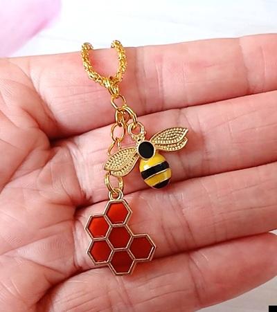 Krásný nerezový řetízkový náhrdelník s přívěskem včela s medovou pláství, spojený pozlaceným řetízkem z nerez oceli. přívěsky májí krásné zpracování. Zapínání na karabinku plus přídavný řetízek. Řetízek se sponou jsou z nerez oceli, pživěsky jsou ze slitiny, barevné smaltování. Velmi vhodný dárek, nebo skvělý elegantní modní doplněk.