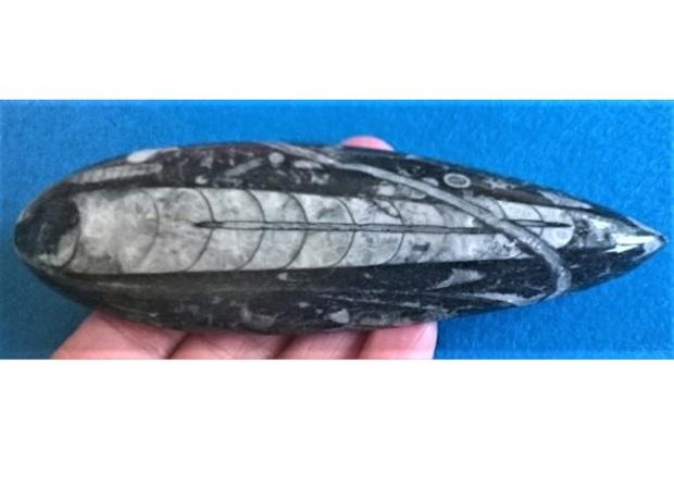 Orthoceras ("rovný roh") je rod vyhynulých nautiloidních hlavonožců omezený na mořské vápence středního ordoviku z pobaltských států a Švédska. Povrch je zdoben sítí jemných lir. Číštění pod tekoucí vodou. Každý kus je originál.