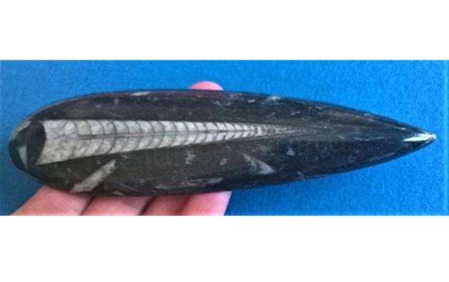 Orthoceras ("rovný roh") je rod vyhynulých nautiloidních hlavonožců omezený na mořské vápence středního ordoviku z pobaltských států a Švédska. Povrch je zdoben sítí jemných lir. Číštění pod tekoucí vodou. Každý kus je originál.