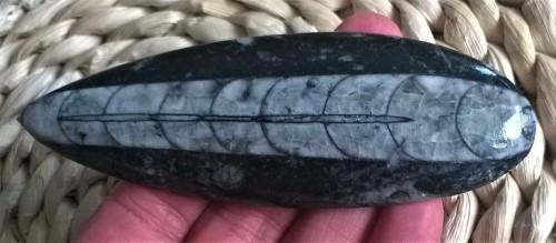 Orthoceras ("rovný roh") je rod vyhynulých nautiloidních hlavonožců omezený na mořské vápence středního ordoviku z pobaltských států a Švédska. Povrch je zdoben sítí jemných lir. Číštění pod tekoucí vodou. Každý kus je originál.