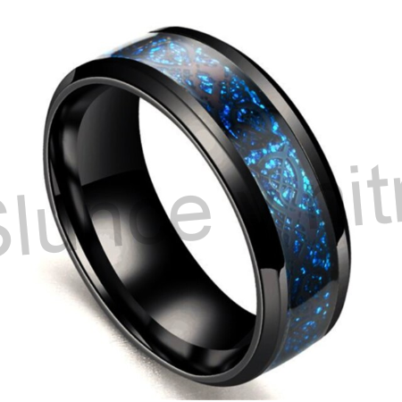 Elegantní snubní, punck, prsten z černé chirurgické oceli s kombinaci karbitu worframu. Tato kombinace působí velmi nadčasově. Prsten má uprostřed krásné třpytivé modré zdobení se symbolem keltského draka, po obouch stranách je černá barva z chirurgické oceli a karbitu worframu. Prsten je pevný a dokonalý, není barvený. Dokonalý dárek, pro všechny.