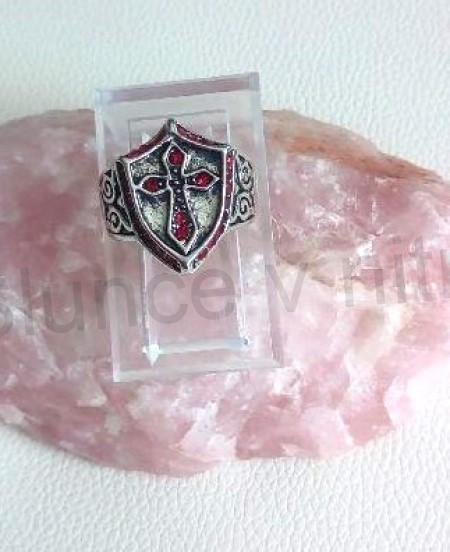 Pánský templářský prsten v platinové barvě s rudými červenými křišťály v kříži a okolo štítu. Krásné zdobení po stranách prstenu. Unikatní překrásný prsten. Tato kombinace černé s červenými křišťály je přímo fascinujicí. Nedá se přehlédnout. Prsten je určen pro věřicí i nevěřicí, kříž je symbol ochrany. Prsten je ve skutečnosti lepší než je fotografie
