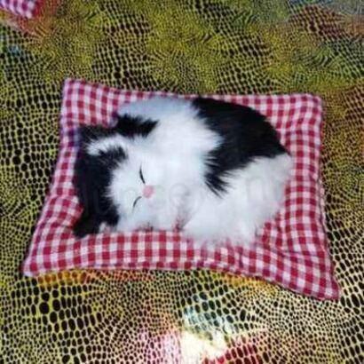 Imitace srsti kočičky přilepená na vnější straně plastové duté tvrdé skořápky. Látková podložka a kočka jsou slepené k sobě, takže ji nemůžete sundat. Kočičkay se nebudou pohybovat, štěkat ani svítit. Spící kočka (nemůže se hýbat, nemůže štěkat, nemá bateri)