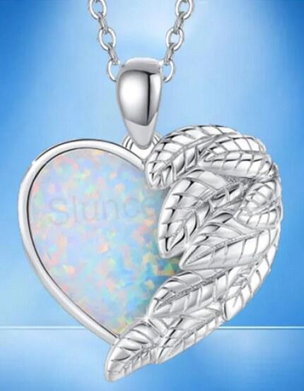 Překrásný šperk Opálový náhrdelník andělským křídlem a srdcem. Přívěšek je do tvaru srdce. Kdy půlka přívěšku je v opálu a druhá půka zaplněná andělským křídlem. Perfektní zpracovaní, leštěné, hladké, pohodlné a snadno se nosí. Vhodné na všechny příležitosti, společnosti. Syntetický opál se může barevně lišit.