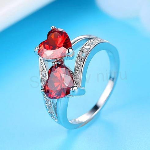 Krásný ozdobný prsten ve tvaru srdce s červenými zirkony (vzhled rubínu). Ručně zpracováný, dokonalá jemná práce. Uprostřed prstenu jsou červené zirkony, kde dobře vynikají jednotlivé plošky brusu, po okrajích prstenu jsou malé čiré zirkony, užasná kombinace, z kvalitního kovu platinovépokovování. Jedná se o český styl. Modní doplněk k ostatním šperkům, krásně ladí. Prsten je zvláštní svou originalitou a krásou.