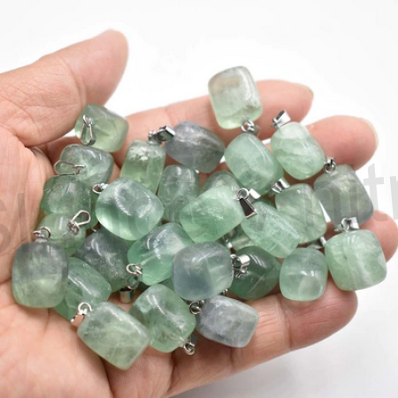 Klasický minerální kamínkový přívěšek Fluorit. Prosím berte na vědomí, že každý kámen je jiný, proto je každý originál, výběr je náhodný. Kamínky jsou různé velikosti a tvarů.