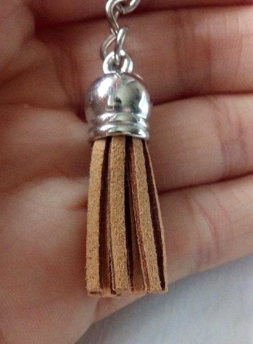 Klíčenka je vyrobena z kvalitního, nezávadného materiálu. Přívěšek je z kožených střapců lepený do stříbrné plastové koncovky. Vhodná na kabelky, tašky, batohy, peněženky, ozdobná dekorace.