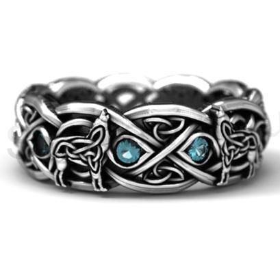 Elegantní prsten skandinávský mýtický vlk, vlka, vrána, amulet vikingský prsten. Tato kombinace působí velmi nadčasově. Prsten má krásné zdobení s dokonalími obrysy a je navíc zdoben modrými zirkony. Vysoký lesk, z kvalitního kovu, stříbrné pokovování, proto je prsten pevný a dokonalý.