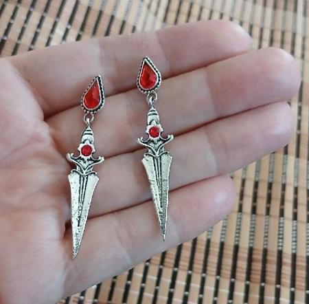 Krásné puzetové náušnice s přívěskem meče a červených kamínků. Náušnice jsou zajištěny kovovou zarážkou, proti ztrátě. Jsou skvělým dárkem pro každou ženu.