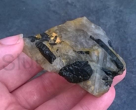 Zajímavá ukázka surového křemene ve kterém je prorostlí turmalín ve více provedení a jsou vidět také stopy mřížek kde se nacházely další turmalíny, které již při nálezu byly vypadaný. Nejdelší délka jednoho turmalínu je 27,7 mm a tloušťka dalšího 13,8 mm