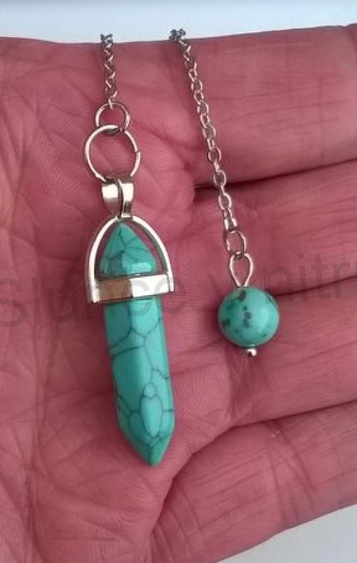 tyrkenitové kyvadlo, kyvadélko-(virgule). Kyvadlo je celé z tyrkenitu i kulička. Nezáleží jaký tvar má kyvadlo, nebo jaký máte typ, na kyvadlo působí vaše energie. Ptáte se otázkami na ano nebo ne. Kde si zvolíte, který pohyb znamená Ano a který Ne.