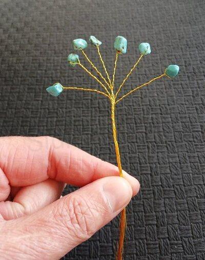 Ručně vyrobená tyrkenit větvička z minerálních korálků a mosazného drátku na strom, stromeček štěstí. Můžete si dát více větviček, nebo jen jednu barvu do vázičky, nebo si seskrádat stromek štěstí, můžete tvořit i stromečkové bonsaje. Větvičky jsou naše ruční výroba. Počet stonků 7 kusů.