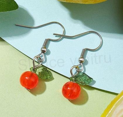 Visací náušnice ve tvaru třešně. Afroháčky jsou z nerez oceli, korálek je z pryskyřice a zelený lísteček je z akrylu. Drobné visací náušnice vhodné jak pro dívky, ženy, pro každodenní nošení.