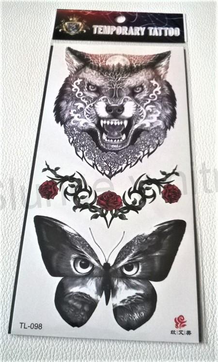 - Voděodolné, dočasné tetovaní Vlk, sova, motýl, růže (E557)